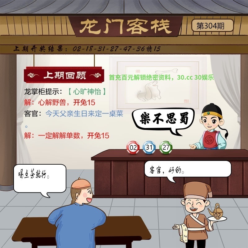306期:【本草纲目】破解龙门客栈 掌柜:悲憤填膺 解释:意思是指悲痛和愤怒充满胸膛 小二:客官,客官,马上来 解释:无 客官:小二,四两白酒一只鸡 解释:四两白酒解四尾和白肖的生肖鼠、虎、牛、鸡、狗、猪 特肖:鸡虎蛇猪猴兔牛马龙 |